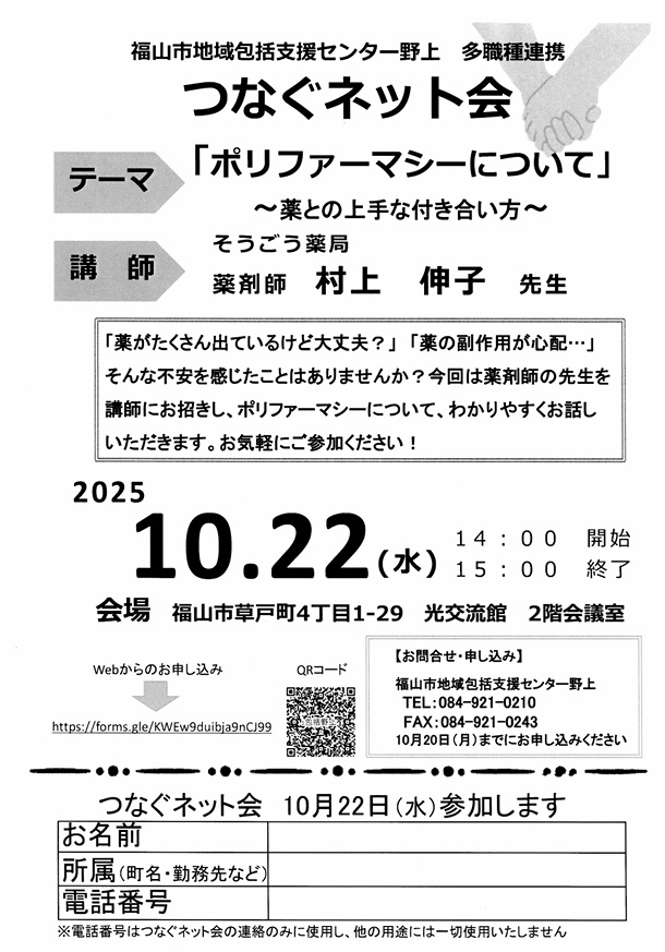 福山市地域包括支援センター野上からのお知らせ 2025年9月26日 最終更新日時 : 2025年9月26日 hikari-user05 10月22日(水) 14:00~つなぐネット会「ポリファーマシーについて」*画像をクリックしていただくと、拡大表示されます。