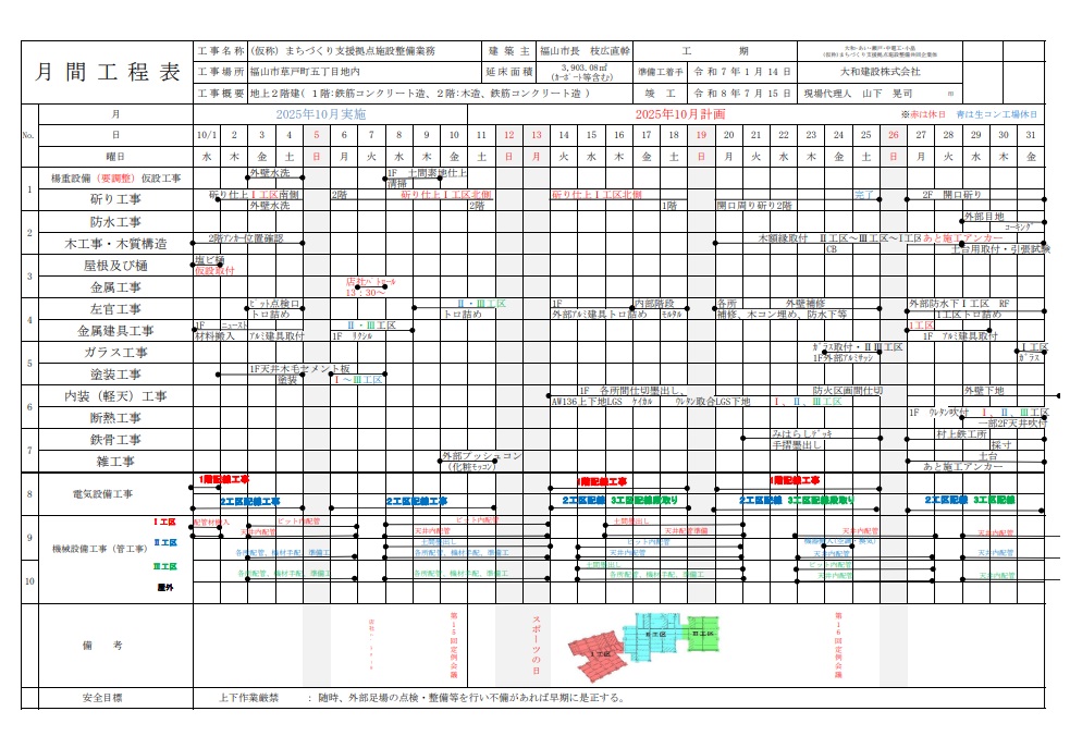 まちづくり支援拠点施設整備(10月分)について 2025年10月14日 最終更新日時 : 2025年10月14日 hikari-user05 まちづくり支援拠点施設(草戸町五丁目・旧体育館跡)の整備について月間工程表(10月分)を掲載します。*画像をクリックすると拡大表示されます。