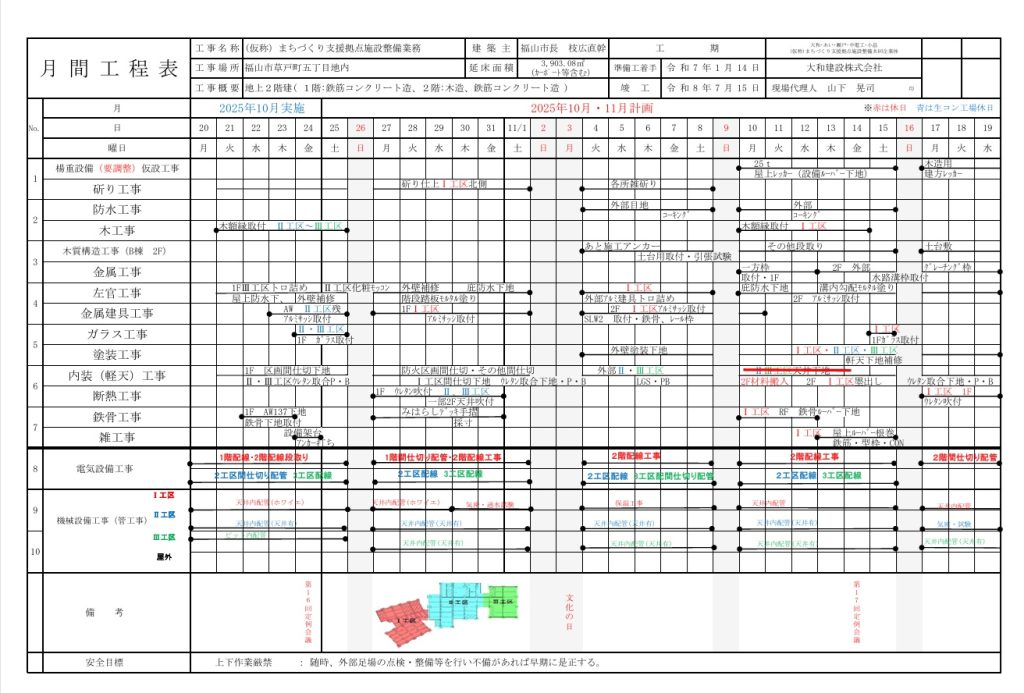 まちづくり支援拠点施設整備(10月、11月分)について 2025年10月28日 最終更新日時 : 2025年10月28日 hikari-user05 まちづくり支援拠点施設(草戸町五丁目・旧体育館跡)の整備について月間工程表(10月、11月分)を掲載します。*画像をクリックすると拡大表示されます。
