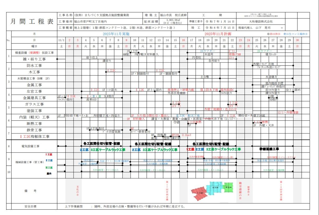 まちづくり支援拠点施設整備(11月分)について 2025年11月18日 最終更新日時 : 2025年11月18日 hikari-user05 まちづくり支援拠点施設(草戸町五丁目・旧体育館跡)の整備について月間工程表(11月分)を掲載します。*画像をクリックすると拡大表示されます。