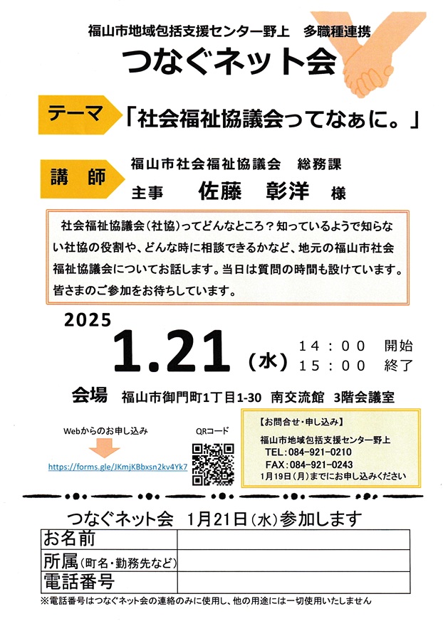 福山市地域包括支援センター野上からお知らせ 2026年1月6日 最終更新日時 : 2026年1月6日 hikari-user05 2026年1月21日(水)「つなぐネット会」のご案内です。*画像をクリックしていただくと、拡大表示されます。