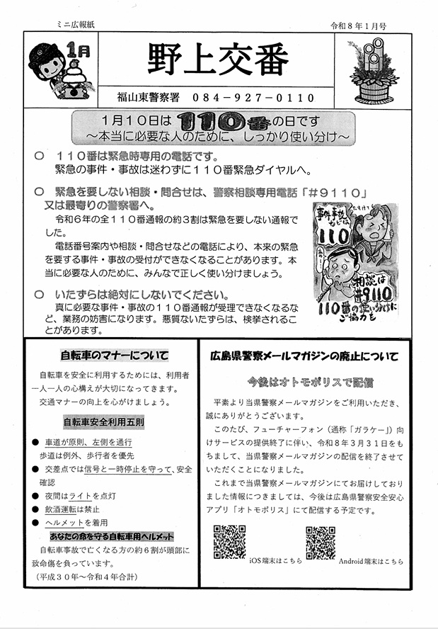 野上交番からのお知らせ 2026年1月6日 最終更新日時 : 2026年1月6日 hikari-user05 野上交番から令和8年1月号のミニ広報誌が発行されました。*画像をクリックしていただくと、拡大表示されます。