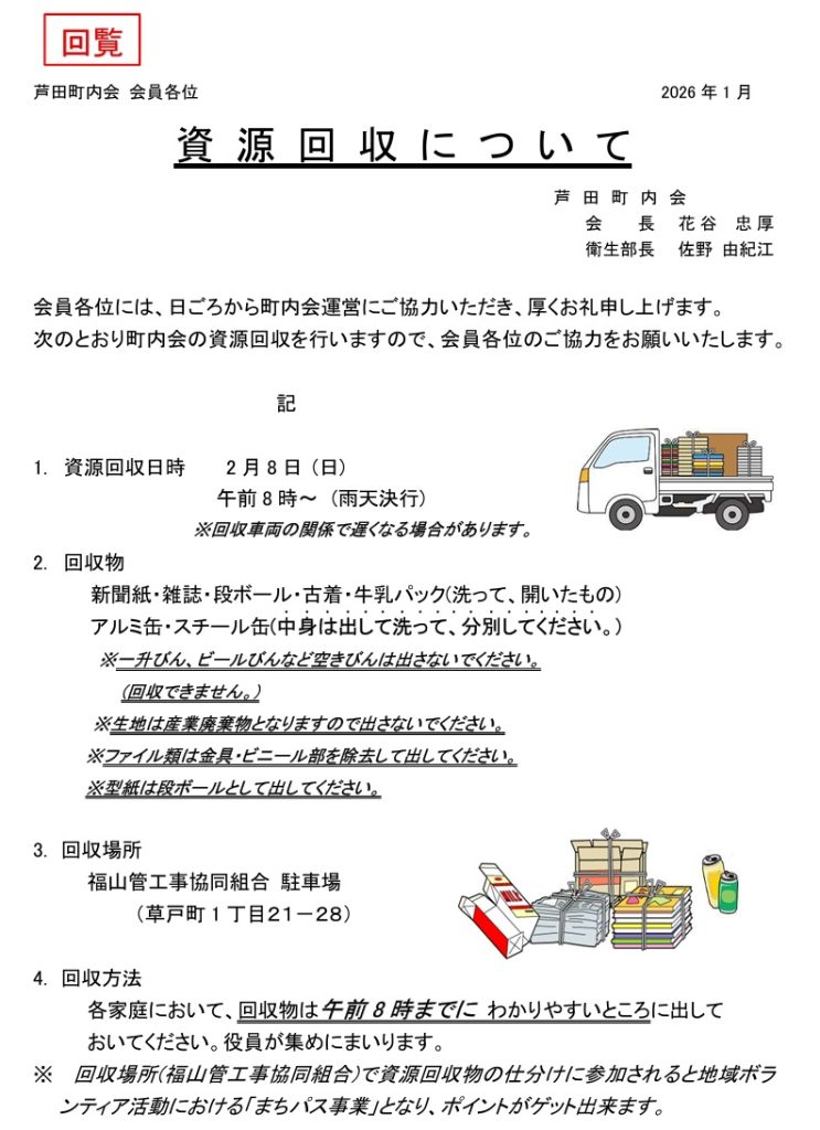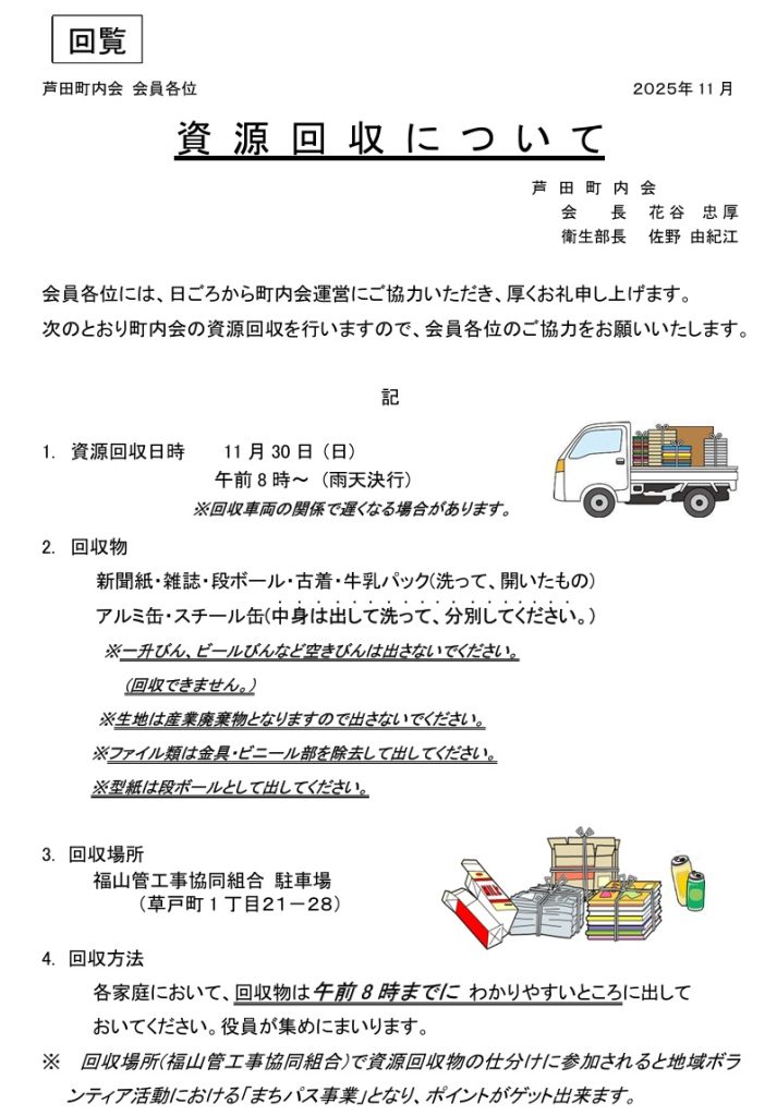 芦田町内会として9月25日午前8時より資源回収を実施します。町内会の皆様のご協力をお願いいたします。