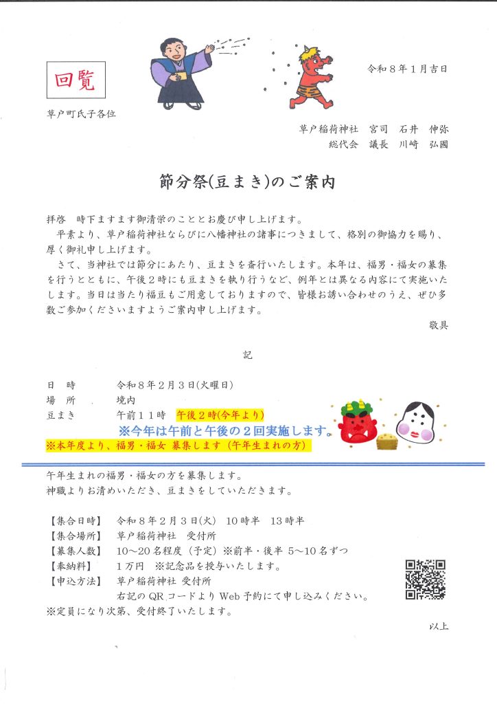 【’25/01/18】2月2日に草戸稲荷神社にて節分祭(豆まき)が催行されます