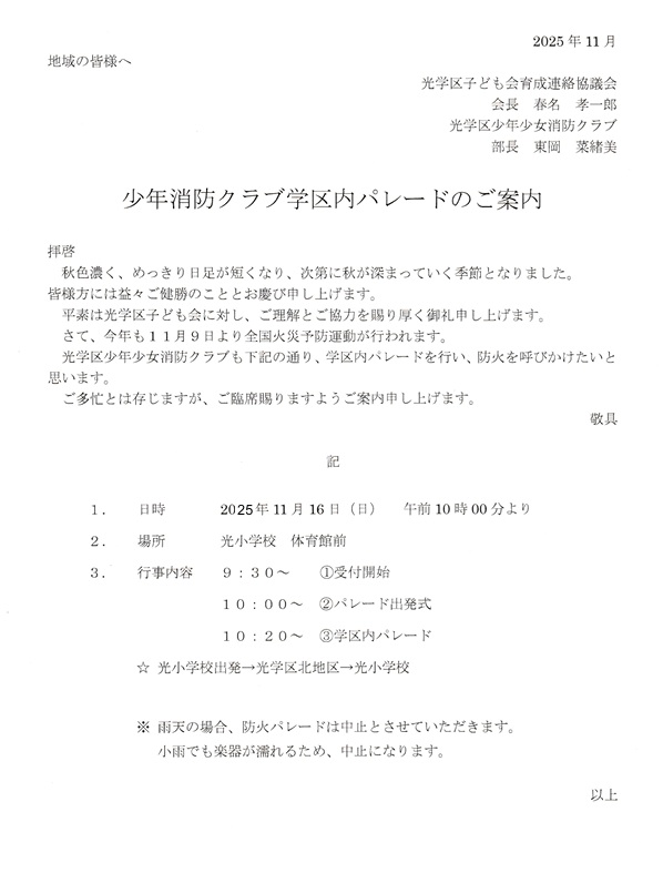 光学区少年少女クラブ学区内パレードのご案内(2025.11.05)