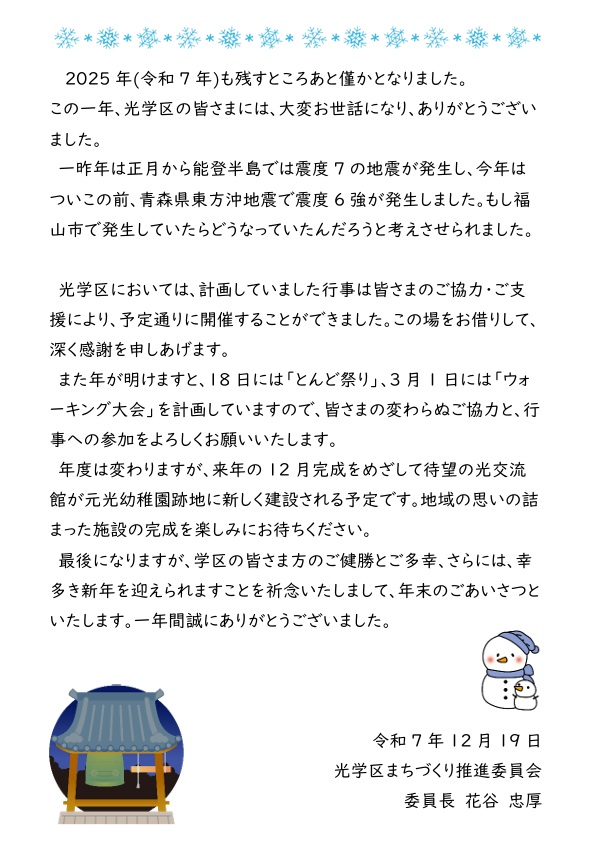 光学区まちづくり推進委員会委員長より年末のご挨拶(2025.12.23)